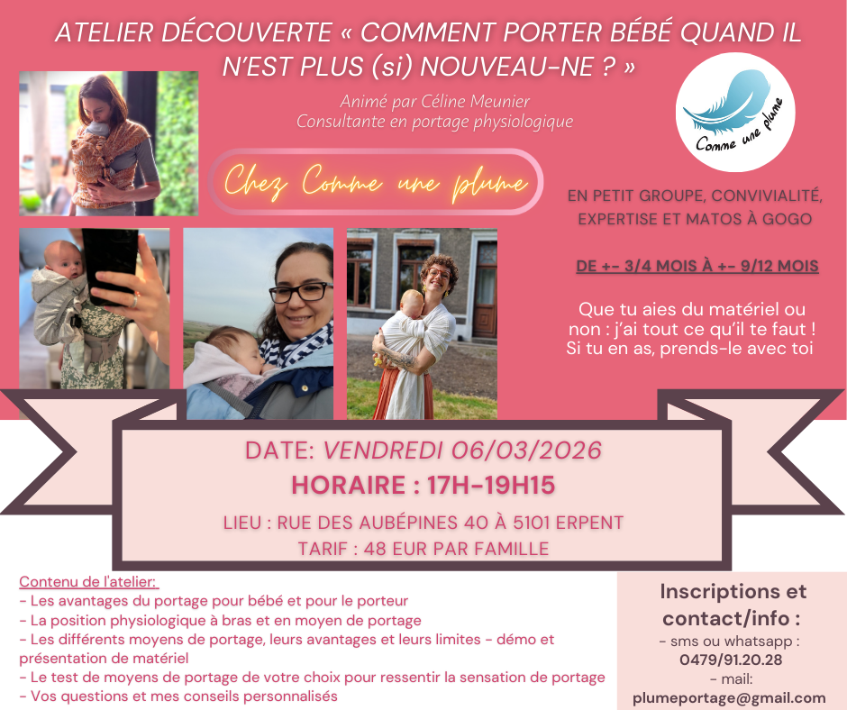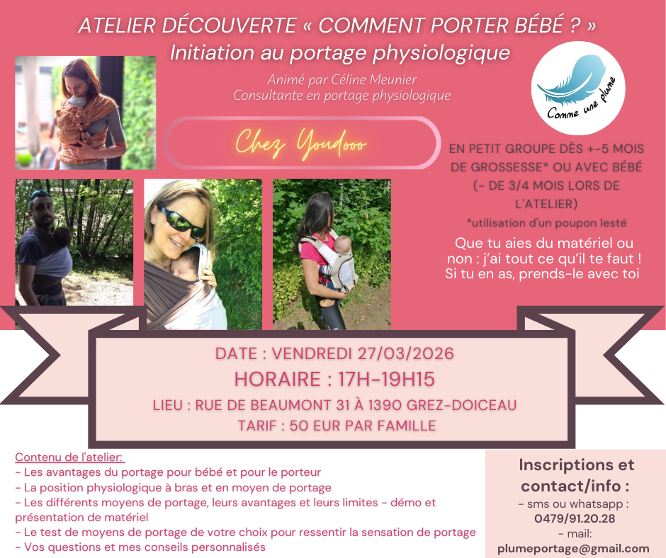 Active dans le milieu de la périnatalité, je vous reçois en tant que monitrice de portage, en atelier individuel ou collectif et en tant que revendeuse de matériel de portage neuf via le webshop. Je propose également de la location de systèmes de portage.